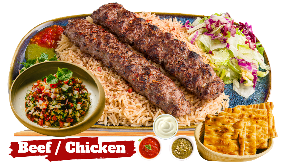 Seasoned ground beef/chicken, broiled on a skewer. Served with basmati rice, fresh baked homemade bread, mixed Afghan salad, and sauces.